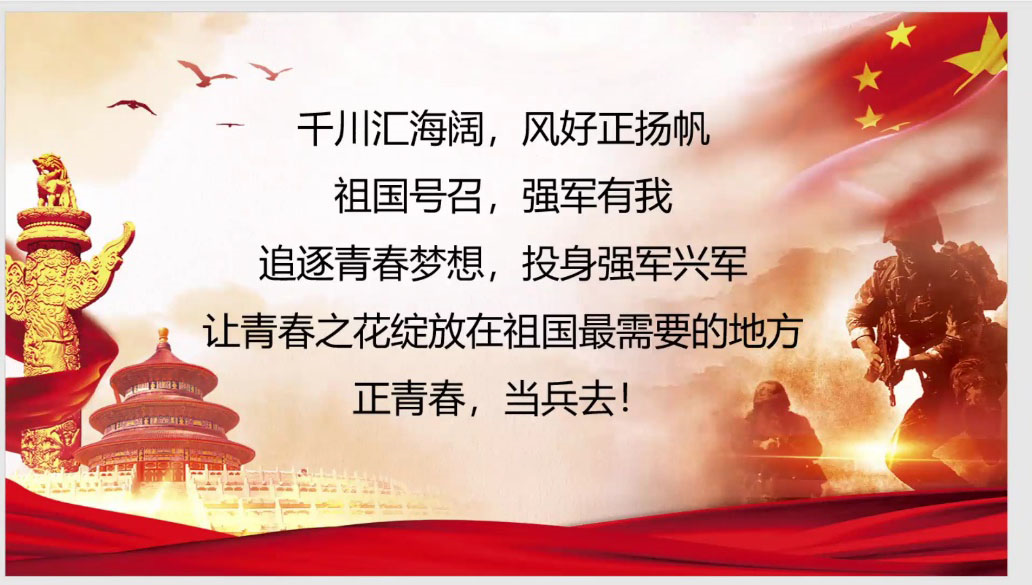 为强化tyc122ccvip员工国防观念,号召适龄青年参军入伍,激发老员工投身国防报效祖国的参军热情,2022年12月5日,公司线上召开了2023年度征兵宣讲会,此次宣讲会由辅导员张翘楚主讲,同时邀请了公司优秀退伍学子杨凌和禹浩亮分享军旅生涯,公司全体员工参加。