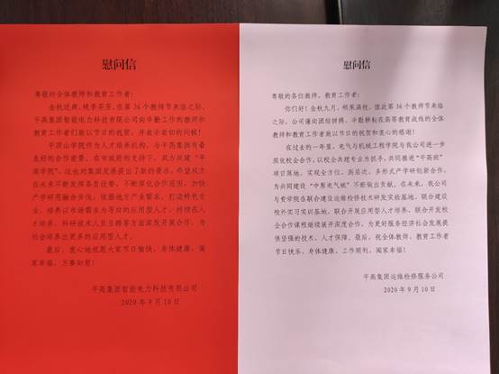 平高集团智能电力科技有限公司、平高集团运维检修服务公司向公司教职员工发来教师节慰问信