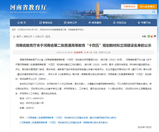 2025年1月2日,河南省教育厅公示了河南省第二批普通高等教育“十四五”规划教材拟立项建设名单。