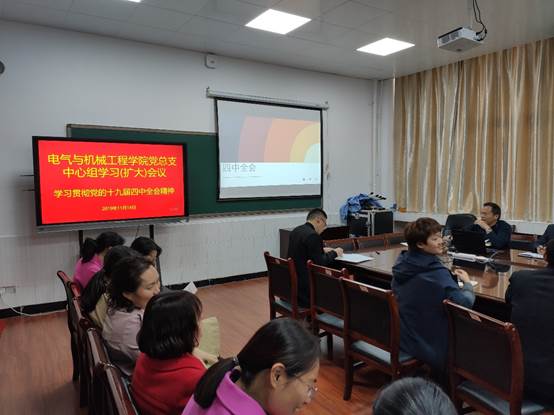 2019年11月14日下午,tyc122ccvip党总支于3314会议室组织中心组理论学习(扩大)会议专题学习贯彻党的十九届四中全会精神会议。本次会议院全体处级干部参加,教职工列席了此次会议。